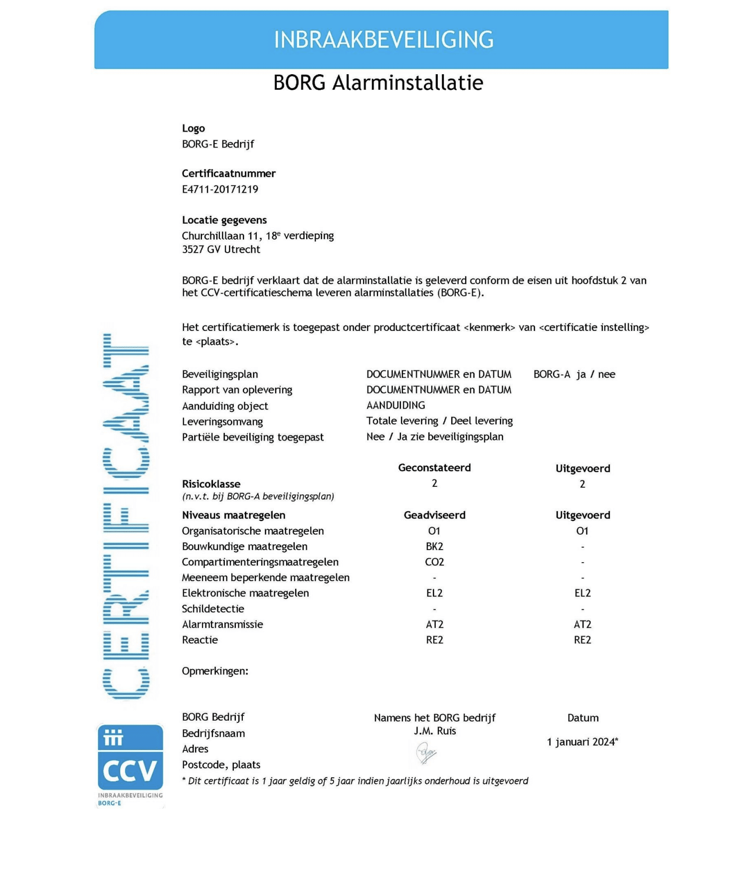 Een BORG-certificaat is een keurmerk van de Stichting Kwaliteit Gevelbouw (SKG) dat aantoont dat een pand voldoet aan normen voor inbraakpreventie en beveiliging. Het certificaat is interessant voor sectoren waar beveiliging belangrijk is, zoals: